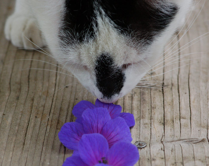 Ich hatte Kater Edgar hier schon mal mit der Irisbluete gezeigt. Heute Morgen habe ich die Blüten von Geranium Gravetye entfernt und zwischen die Latten der Terrasse gesteckt und jetzt seht, wer seine Nase gleich wieder in alles reinstecken muss.