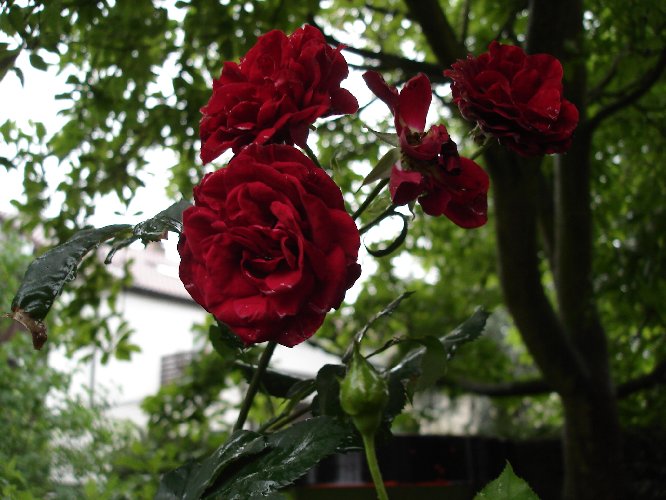 12. Tag, 50 jähriger dunkelroter RosenstockNach 2 Tagen Dauerregen und Sturm heute fotografiert bei Regen. Die erste Blüte, welche sich vor 12 Tagen öffnete, hat jetzt die Blütenblätter verloren. Unabhängig vom Wetter, egal ob es sehr heiß ist oder regnerisch, bleibt die dunkelrote Blütenfarbe einmalig schön erhalten. Außerdem sieht man bei den Blütenblättern 2 Tage Dauerregen fast nicht.PS die Kinder des früheren Hausbesitzers wollen jetzt überprüfen, ob bei den Unterlagen des Hausbaus auch noch die Rechnung des Gärtners von 1957 vorhanden ist und ob dort die Rosensorte aufgeführt ist. LG von Gerardo