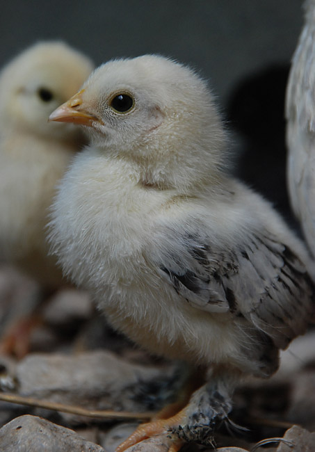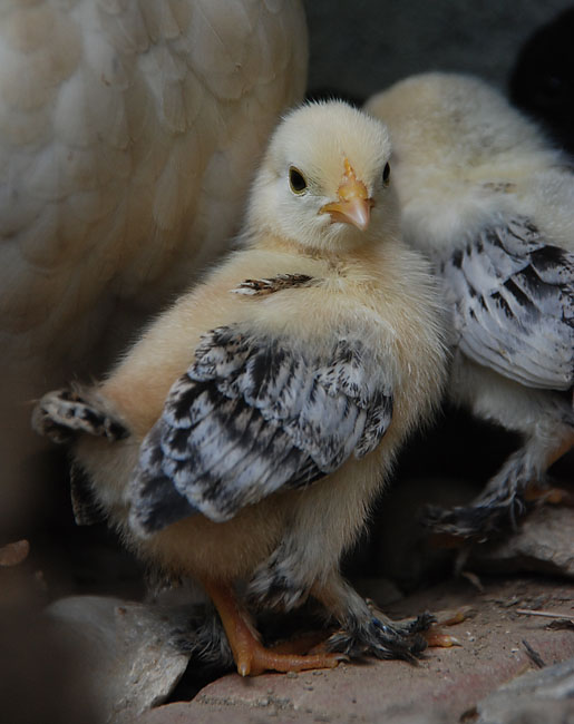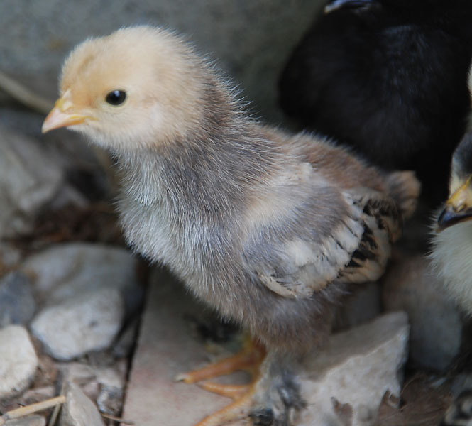 Ich hab noch nie darüber nachgedacht, ob ich sie mag, weil ich das die einzigen Zwerghühner sind, die ich kenne. Nur ein paar von ihnen haben keine Federn an den Beinen und weil die Eier eben gemischt waren, haben sich wohl zwei vererbt. Am schönsten ist die Befederung beim Hahn, deswegen ist nicht klar, wer nun dran 'schuld' ist. Was ich nicht mag, sind die erwähnten puschelschwänzigen und rosettenfiedrigen Hühner, sie schauen nimmer aus wie etwas, das am Misthaufen scharren sollte.Das dunkle Küken habe ich auf Seite eins schon mal gezeigt. Es ging schon am ersten Tag als Küken eines Wildvogels durch. Darum bin ich sehr gespannt, wie es einmal wird. Auch die Hellen Hühner mit den fleckigen Flügeln werden spannend. Eins ist gelber als das andere, sicher wird es dunkler, wenn es groß ist. Aber noch haben sie am Körper Flaum und keine Federn. Das dauert noch.
