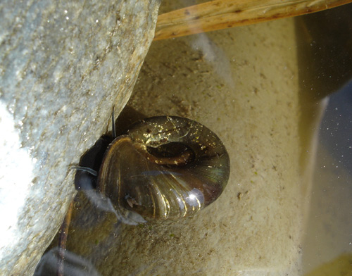 Die Posthornschnecke hat den relativ milden Winter gut überstanden. Jetzt ist sie öfter beim Sonnen zu beobachten, ganz wenig unter der Wasseroberfläche, dort wo es in dem Teich wohl am wärmsten ist.