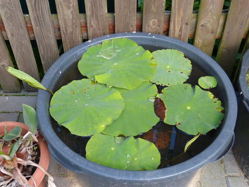 Für Blüten ist es wohl noch zu früh. Zunächst war offenbar das Rhizom von 'Empress' beschädigt und gammelte. :( 'First Lady' wuchs hingegen drauflos. Vor gut vier Wochen ging es dann nach draußen. Bisher gab es nur Schwimmblätter, im Moment schiebt sich offenbar das erste aufrechte Blatt raus. Ein Blick unter die Blätter zeigt aber, dass die Pflanze gerade fleißig den Bottich umrundet, ich rechne also mit zunehmender Grünmasse. :)