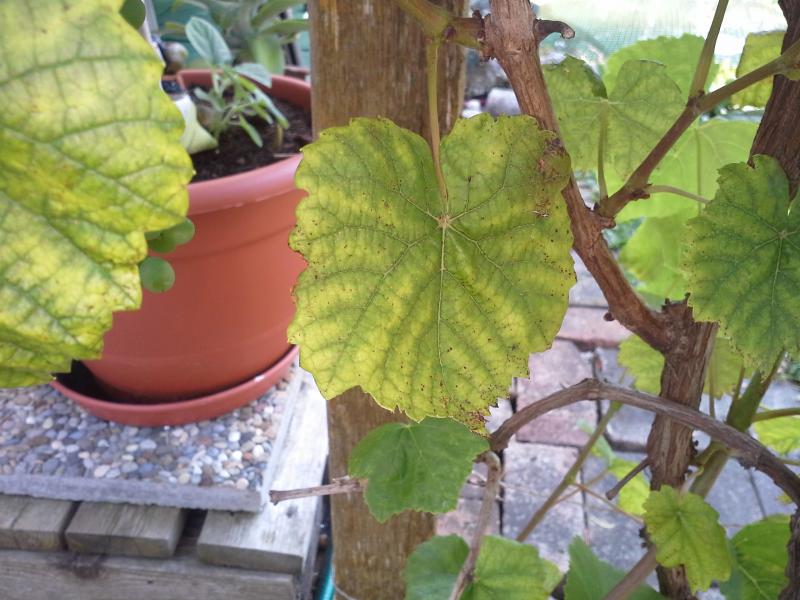 Ist aber nicht wirklich wichtig ;)Nun zum Problem, das hab ich mir auch schon gedacht, das eigentlich die Anderen Pflanzen rundherum relativ gut ... also zumindest satt grün aussehen und nicht gelb, von daher hab ich auch die Hoffnung, dass kein Salz problem im Boden vorliegt. Aber ich muss leider widersprechen, denn die Pflanzen ringsherum sind der Info halber Pfingstrosen und die haben wenn man sich mal das blatt genau anschaut, einen massiven Mangel , Kaliummangel. Was mich nicht verwundert. Nur was fehlt dem Pluot? Und noch eine ungenaue allgemein Ansicht:Hoher PH Wert=Kalk= nicht immer richtig, denn ein hoher PH Wert geht nicht immer einher mit Kalk ;)Zudem hat mein Wein Kalkmangel gehabt, da ich Jahre lang nicht gekalkt habe bei 7, 4 P.H. nun dieses Jahr strekte er so dermaßen die Hufe, dass ich endlich gekalkt habe und siehe da es kamen so gesunde sattgrùne Triebe , wie schon lange nicht mehr. Hier ein Bild des Mangels der Weinrebe:Gruß.