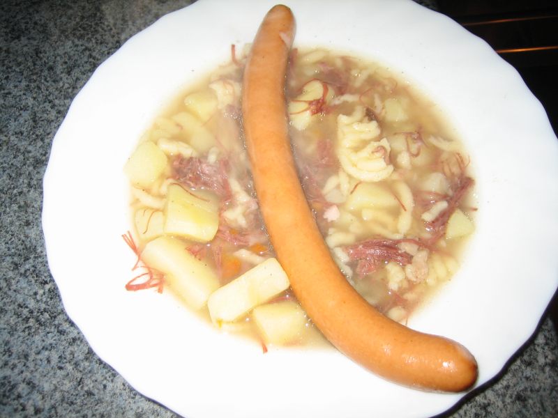eine Mischung, auf die ich selber nie gekommen waere. Als Kroenung kamen ein paar Streifen angebratener Speck oben drauf.