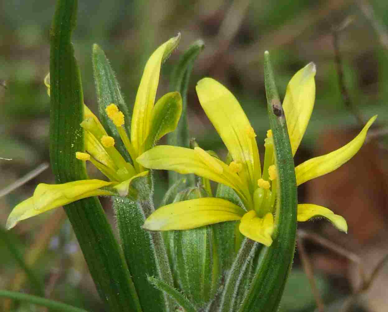 der ist sehr hübsch, knorbs, und das Gelb ist sehr angenehm.Gagea villosa, der Ackergelbstern hat behaarte Stengel, Blütenstiel und Blütenblätter sind sehr kurz behaart. Blüten zu 5 bis 12 und die Blüten sind nur bei Sonne geöffnetEr kommt vor auf mäßig trrockenen, kalkhaltigen, sandigen Böden, in Weinbergen ... an Feldrainen aber nur noch selten auf Äckern. Gern zusammen mit Allium vineale zwischen Karlsruhe und Weinheim kommt er hauptsächlich vor.(Farn- und Blütenpflanzen BW Band 7)