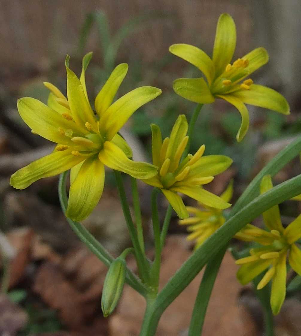 Gagea luteaIst kein bisschen gelber als die anderen. Blüht früh, aber nach G. bohemica. Ein gutes Merkmal ist der aufrechte Wuchs und der lockere Blütenstand, außerdem die Kahnspitze der Laubblätter. Blüht zuverlässig und versamt sich auch, ist überhaupt der einzige, bei dem ich immer fruchtbare Samenkapseln finde.