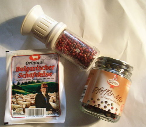 das ist grob zerbröselter Feta (200 Gramm), er wird lageweise mit 3 Esslöffel fein zerbröselten Duftrosenblätter und Rosenpfeffer in ein Glas mit Schraubdeckel gegeben, mit kalt gepresstem Sonnenblumenöl aufgefüllt, ca. 3 Tage bei ca. 12 ° ziehen lassen, er ist zum sofortigen Verbrauch bestimmtLuna, was ist Rosen-Feta?