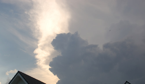 Die ersten Boten der Störung sind angekommen: Dunkle Wolken von Westen und Donnergrollen aber leider, leider kein Regen und immer noch 30°C.