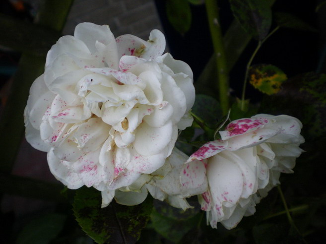 Meine WC, äh, Winchester Cathedral hat manchmal auch solche Halb/Halb-Blüten oder welche mit rosa Flecken/ Sprenkel auf weissem Grund.Zurzeit sind jedoch alle Blüten rein weiss.Leider machen sich in den letzten Tagen die ungeliebten grossen Heuschrecken über die letzten Rosenblüten und die frischen Knospen her, auch die Winchester scheint lecker zu sein