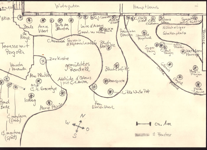So, nun hab' ich eine erste Planung gemacht.Zusätzlich aufgenommen wurden erst einmal:Boule de Neige :-*Perle des Blanches :-*Louise d'Arzens :-*Blanche Lafitte :-*Marie Pavie :-*und eine "fleur du mal":Souvenir d'Alphonse Lavallée :-*Hier eine erste Skizze, Resultat durchwachter Nacht