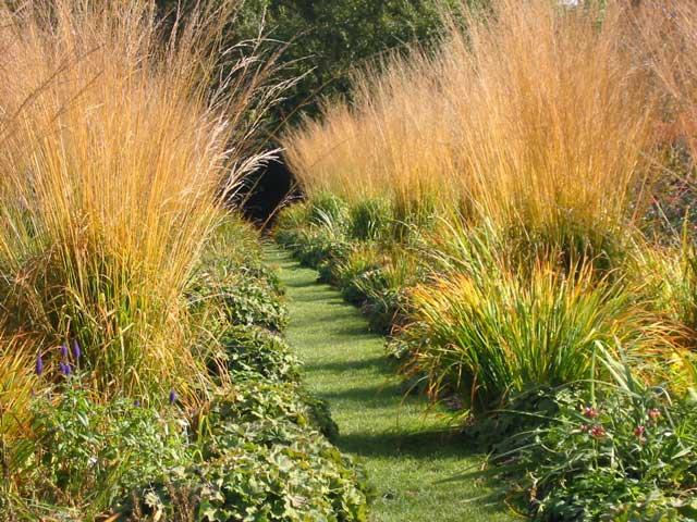 Die Stipa ucrainica, welche bei mir auch völlig untypisch steht (Waldrand) macht sich dort sehr gut und wird jetzt im Herbst Hangaufwärts neben dem Knüppelweg weitergeführt.Ein Gras was das ganze Jahr gut aussieht. Ich schneide es erst kurz vor dem neuen Austrieb im Frühjahr ab.