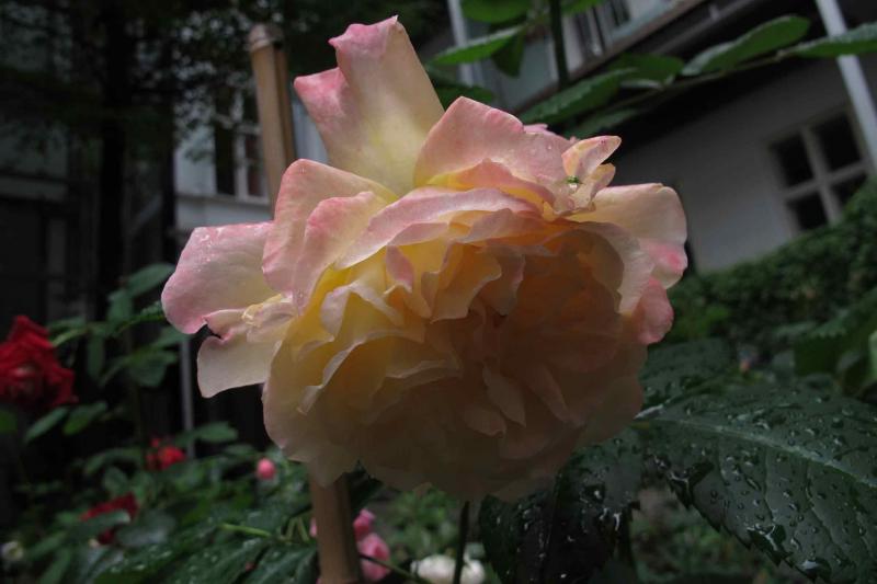 Im Parterre - sofern man das so sagen kann - habe ich im Frühjar 2011 zu den vorhandenen THs und Engländerinnen Penelope, Trier, Cornelia und Felicia gesetzt, quasi im Viereck, entsprechend der (unereglmäßigen) Form des Beetes. Felicia war als Container gekommen und hat im Vorjahr schon geblüht, ihre Knospen müssen erst aufgehen, ebenso Cornelia. Penelope war im Vorjahr sehr zurückhaltend und zeigt jetzt erstmals ein Blütenbüschel, inzwischen etwas regengeschädigt (ein anderes ist noch am Start):