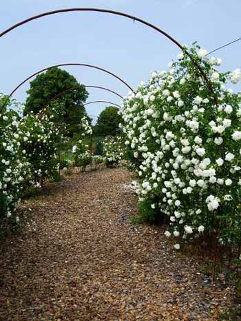 Freiburgs Idee mit den "einseitigen" Bögen wäre dann gut realisierbar, wenn das spätere Haupt-Gewicht der Rosen auf eurer Hausseite durch ein an der Wand befestigtes/verschraubtes "Spalier" (also Baustahlmatten, die solidebefestigt sind) gehalten würde.Ein Spalier wirst du sowieso brauchen, um alle Neutriebe gleich seitlich zu befestigen.Passiert das nicht, werden alle Rosen zu breit und versperren die Durchfahrt.FdRs Vorschlag mit den kletternden Noisettes halte ich für eine gute Idee: Der Platz ist ja sehr geschützt, daher dürfte es in Zone 7b keine Probleme geben.Einmalblühende Riesen-Rambler solltest du m.E. dagegen wirklich außen vor lassen: Eine einzige Venusta pendula z.B. würde sonst den ganzen Tunnel okkupieren und anderen Rosen nicht genug Licht lassen Die wachsen einfach zu schnell und zu sehr in die Breite. Es macht auch nicht wirklich Freude, jede Woche daran rum zu schnippeln und zu binden...Madeleine Seltzer ist zwar auch einmalblühend, aber nicht ganz so wüchsig und völlig stachellos.Mein Vorschlag für die Einmalblühenden wäre (abgesehen von MS, die auch noch toll duftet) deshalb Mme Legras de St. Germain und/oder Chloris und/oder Mme Plantier. - Die haben alle kaum bis gar keine Stacheln und wachsen (erstmal) schlank nach oben.Als öfterblühende Komponente dann etwas schwächer (als MAC, die wird m.E. zu breit) wachsende Noisettes und/oder öfterblühende, kleine Rambler, kombiniert mit Clematis.Wird bestimmt wunderschön, der Tunnel!