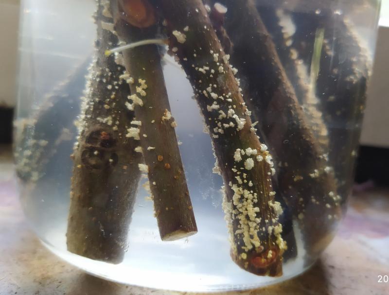 Stecklinge und Steckhölzer übern Winter haben nicht funktioniert. Da aber immer Schnittmaterial anfällt, habe ich vier Stücke letzte Woche in Wasser gestellt. Das sieht ganz gut aus und die Triebe kriegen unten kleine weiße Nöppel, die Vorstufe von Wurzeln.