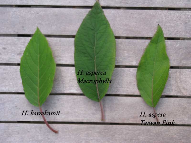 Hier zum Vergleich. meine H. kawakamii mit der normalen H. aspera 'Macrophylla' und 'Taiwan Pink', die auch in die Kawakamii-Gruppe gehören könnte.Das Laub von beiden ist deutlich kleiner als bei 'Macrophylla', "dünner", weniger strukturiert und fühlt sich glatter an.Weiterhin zeigen beide einen purpurfarben überhauchten Neuaustrieb.Wie groß jedoch die Streuung bei den in Kultur befindlichen H. Kawakamii ist kann ich auch nicht beurteilen.Hilft Dir das vielleicht schon weiter?