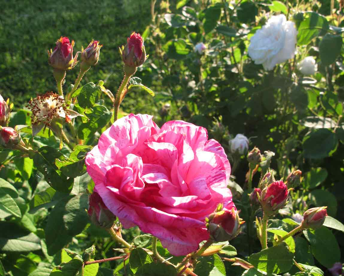 Versicolor war noch 2009 ein Busch von 1,5 m und mindestens ebenso breit. Sie ist für mich der Beweis, daß Ausläufer die Mutterrose doch schwächen, denn seit sie so produktiv ist, erreicht sie nicht mehr ihren früheren Glanz. Oder hat sie den starken Rückschnitt nicht gut vertragen?