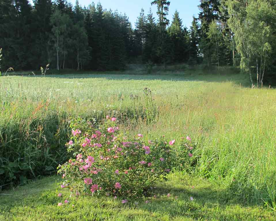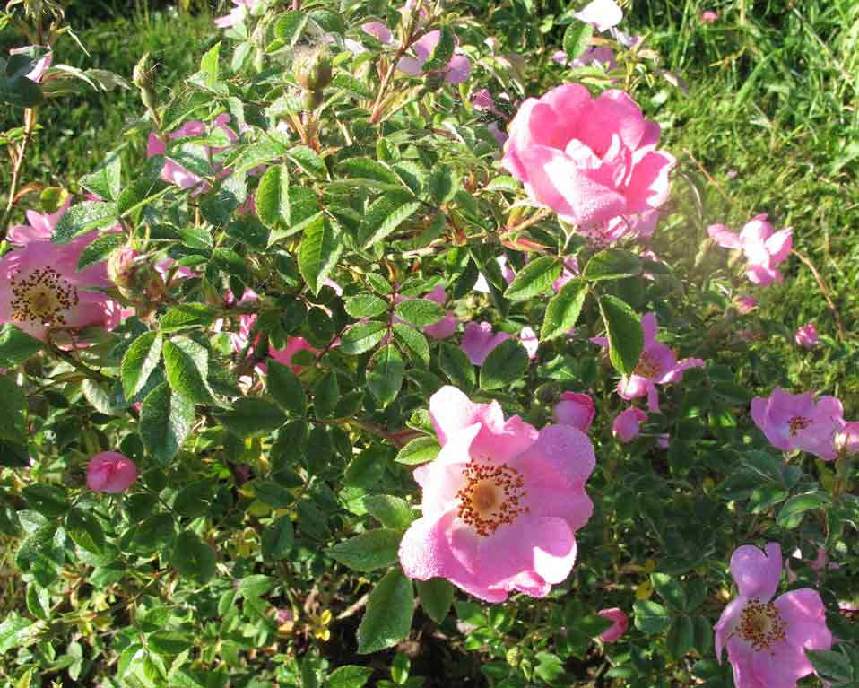Ursprünglich hatte ich drei Büsche von Rosa virginiana gesetzt, inzwischen schicken sie sich an, mit ihren Ausläufern die ganze Wiese einzunehmen. Aber auch sie, Standort Nordseite, völlig ungeschützt, mußten voriges Jahr auf 20 cm geschnitten werden. Als Spätblüher fangen sie gerade erst an, dafür dauert es dann ein paar Wochen. Ihre schönen Hagebutten dienen offenbar Zugvögeln als Kraftnahrung, sie sind manchmal von einem Tag auf den anderen ratzeputz verschwunden.