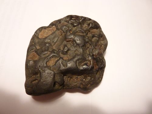 Solche Steine findest Du hier in den Sandgruben in Mengen. OberfrankenMeist silikatgebundener oder auch eisengebundener Sandstein (sehr dicht und schwer) mit starken Einsprengseln von Eisennuggets. Die können einzeln soweit ich gesehen habe auch einige Kilo schwer sein. Meist aber so klein. Ausgefälltes Eisen. Ganz sicher nicht, wenigstens bei uns, anthropogenen Ursprungs. Über 100 Millionen Jahre alt.In manchen ist das Eisen ganz herausgewittert, dann sind das wunderschön geformte sehr schwere Eisenerzstücke. Ich habe noch einen ganzen Haufen dieser Nuggets die ich in der Mittelfränkischen Sandachse gesammelt habe in meinem Garten rumliegen.