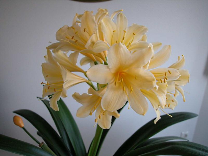 Das ist ein guter Vorschlag von RosaRot. Wenn die Pflanze genügend Blätter und die Blütenanlage bilden konnte sowie die erforderliche Zeit für die Kühlphase unter 15 °C zur Beendigung der Ruhephase der Blütenanlage bekommen hat, muss man nicht unbedingt warten, bis sich der Blütenschaft zwischen den Blättern zeigt. Man kann die Pflanze auch ruhig vorher wärmer stellen. Wenn die obigen Bedingungen stimmten, wird sie noch blühen.Hier eine nette gelbe Klivie. Ich drehe meine Klivien alle zwei Tage um 180 Grad am Fenster, wenn der Blütenschaft wächst, damit er nicht so schief wird. Dann stelle ich die fast voll erblühte Klivie ins Wohn- oder Esszimmer, so dass ich sie sehr oft sehen und genießen kann. Natürlich würden meine Klivien auf dem kalten Dachboden viel länger blühen, aber da bin ich nun einmal sehr selten. Ich weiß gar nicht, warum immer noch diese seltsamen Anweisungen wie „immer auf dem selben Platz stehen lassen, bloß nicht drehen, sonst fallen die Blüten ab usw.“ immer wieder erteilt werden. Häufig liest man dies in Gartenforen oder ein Buchautor scheint unbewiesene Behauptungen von einem anderen abzuschreiben. So ähnliche Beispiele findet man auch bei der Kamelienkultur. Viele liebe GrüßeElke