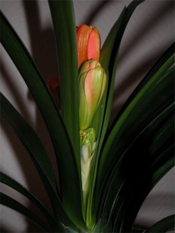 Es freut mich, dass Euch die gelbe Klivie gefällt. Aber ich möchte trotzdem eine Lanze für orange blühende Klivien brechen. Gerade, wenn sie in der kalten und häufig sehr ungemütlichen, grauen und blütenarmen Zeit blühen, empfinde ich jedes Mal eine große Freude, wenn ich meine orange blühenden Klivien sehe. Ich könnte mich dann an ihnen festschauen. Uliginosa,der Hinweis von RosaRot ist eine sehr gute Richtlinie. Wenn die Klivie unter 10 °C (kein Frost!) steht, könnte man die Kühlphase sogar noch etwas verkürzen, vielleicht auf 8 Wochen.Alle,zu Anfang meiner Klivien-Begeisterung habe ich auch schon Misserfolge mit den Blüten gehabt. Hier könnt Ihr eine Serie von Bildern einer Klivie sehen, die eine zu hohe Kühltemperatur hatte. Ich war nämlich der Meinung, weil mir das Schlafzimmer immer so kühl vorkam, müsste es auch kalt genug für die Klivie sein. Mit einem Minimax-Thermometer habe ich dann einmal jeden Tag über mehrere Wochen die Temperatur gemessen und notiert. Die Temperatur war nur an ganz wenigen Tagen unter 16 °C. Wenn die Blüten sich schon wie auf dem Foto zwischen den Blättern entwickeln, ist es ein Zeichen, dass die Kühlphase entweder zu kurz war oder dass die Temperatur zwischen 15 und 20 °C war. So wie auf dem ersten Bild fängt es an. Die Blüte entwickelt sich zwischen den Blättern und man freut sich als ahnungsloser Anfänger höllisch, wenn man diese Blüte sieht: