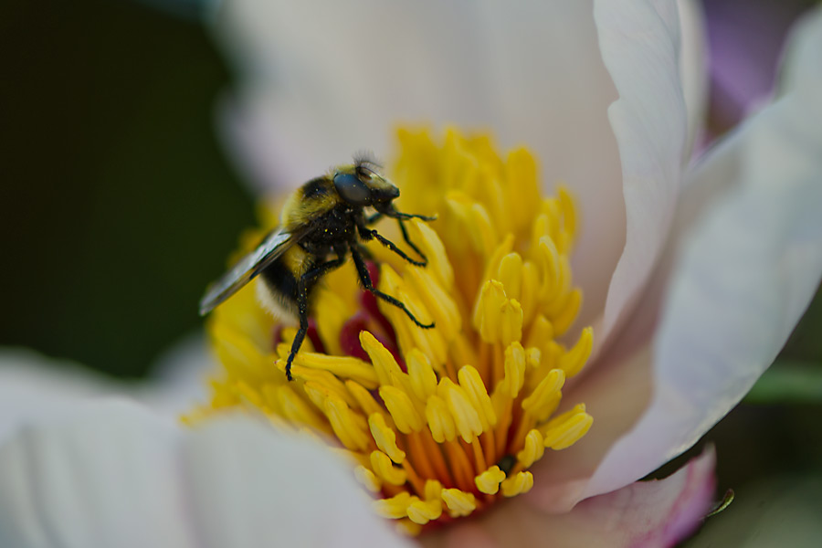 Wer labt sich an der Pfingsrose?Ist es eine Bienenschwebfliege oder eine Sandbiene oder was?