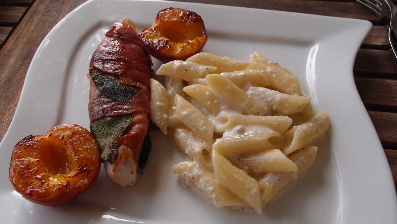 heute gabs saltimbocca (aus pute) mit gebratenen nektarinen und nudeln mit gorgonzola...