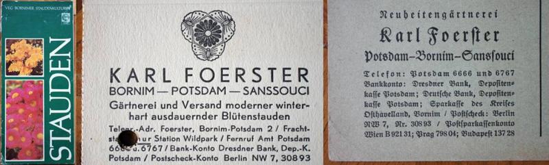An dieser Liste bin ich sehr interessiert. Vielleicht gibt es eine Möglichkeit, sie mir als Kopie zukommen zu lassen? Das wäre wunderbar.Ich habe mal gekramt und alte Foerster-Gärtnerei-Firmenkarten sowie einen Katalog der VEG Bornimer Staudenkulturen von 1982 gefunden:Ich glaube, irgendwo habe ich noch eine komplette Liste aller Foerstersorten. Diese wurde vor Jahren von Marie Louise Kräutler erstellt.