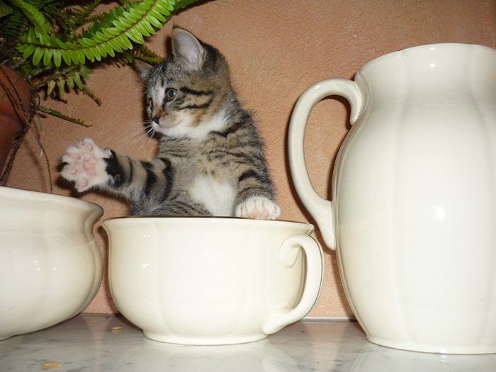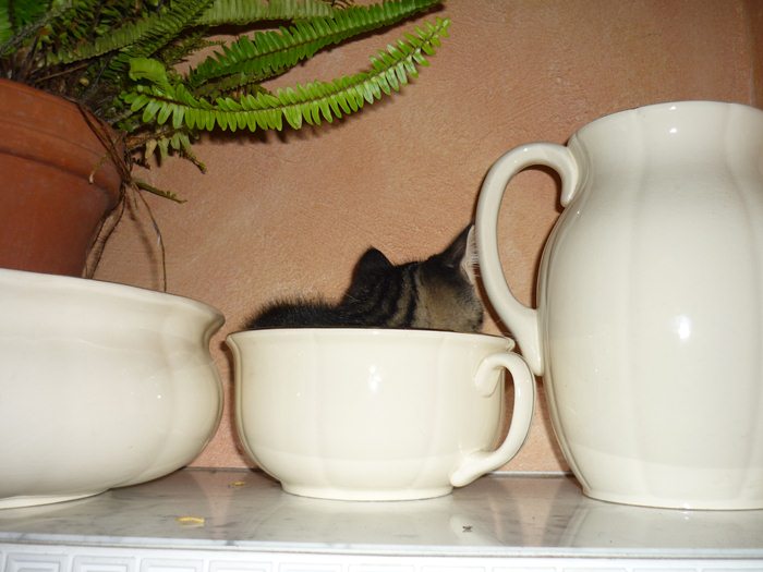 OTFips im Nachttopf ;DFips ist 10 Wochen alt und erst seit kurzem bei uns , der bringt wieder richtig Leben ins Haus . Seine 13 jährige Katzenmitbewohnerin hält noch nicht allzuviel von dem Getobe , Hund schon , aber Fips mit Hund noch nicht