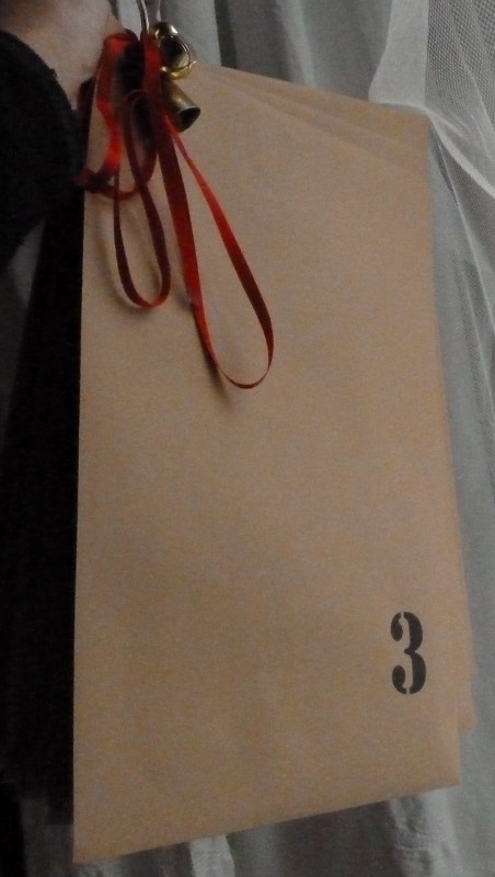 Er besteht aus A4-Packpapiercouverts, einem Metallring, Druckertinte, Glöckchen, etwas Geschenkband und Inhalten.