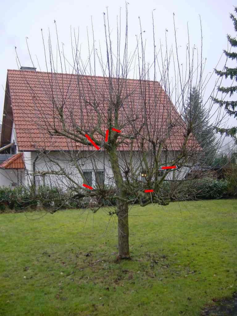 Danke für die Antworten. So wie ich es verstanden habe, jetzt im Frühjahr nichts mehr machen, sondern bis zum August warten. Ist das unabhängig davon, ob der Baum Früchte trägt oder nicht?@ Elro"Leider nie ableitend und auf Astring geschnitten, überall Stumpen." Das verstehe ich nicht! Wie schneidet man ableitend bzw. auf Astring?"Dazu wenn möglich auf nach außen flacher abgehende Äste zurücksägen." An welcher Stelle muss ich die Säge ansetzen?@landfogt"ich würde da nur die nach innen wachsenden triebe entfernen. auch die stumpen müssten oberhalb des neuen triebs abgesägt werden" An welcher Stelle muss ich die nach innen wachsenden Triebe und die Stumpen absägen?@jkrDa der Baum im Sommer unheimlich viele Blätter trägt, ist es in der Tat sehr unübersichtlich. Macht es Sinn, schon jetzt die Teile, mit z. B. Bändern, zu markieren, die enfernt werden sollen? Welche Äste sollten Leitäste werden und welche sollten entfernt werden. Ich habe den Baum unten größer rein gesetzt. Vielleicht sieht man mehr! Und auch an Dich die Frage: An welcher Stelle muss man die Säge ansetzen? [img]http:////bkhardy.gmxhome.de/abbel_gross.jpg[/img] Ich hoffe, ich nerve nicht zu sehr mit meinen Nachfragen.