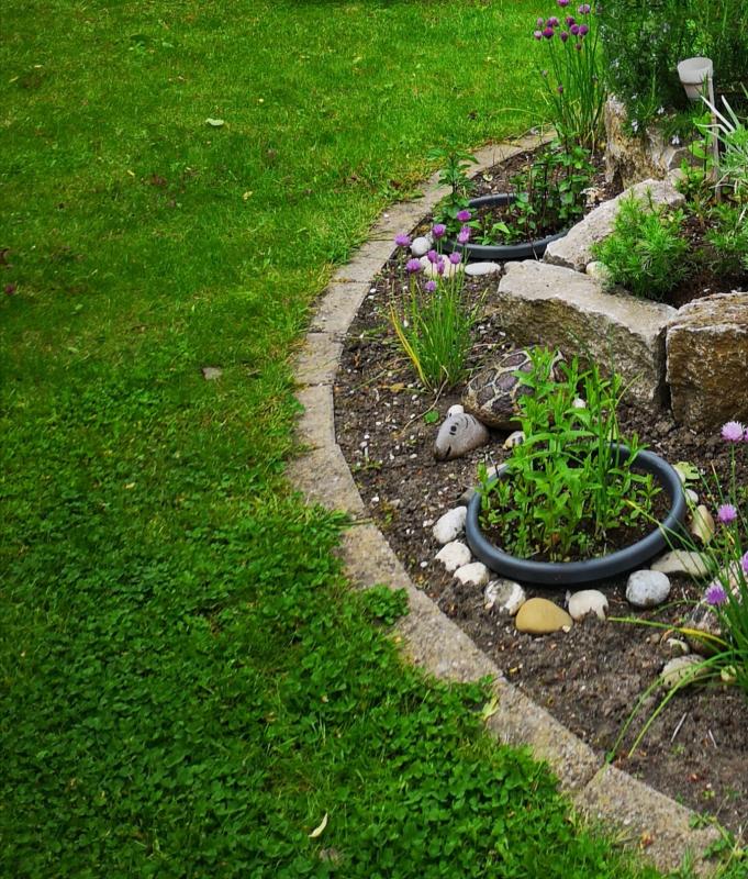In unserem Garten hat sich die Einbettung von Beeten in eine einfache Pflastersteinumrandung (nicht betoniert, einfach verlegt, m2 11,-) , auf der dann mit einem Rad des Mähers gemählt werden, sehr bewährt. Hilft, dass die Spirale nicht schnell von außen zuwuchert (?)