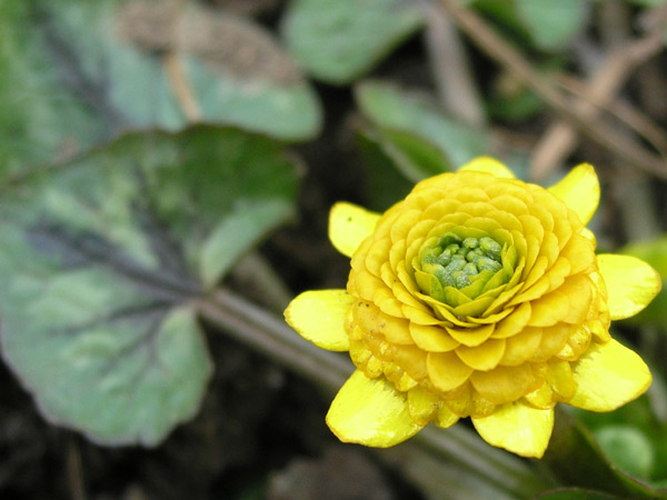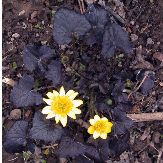 Gestern hat mein erstes Scharbockskraut die ersten zwei Blüten geöffnet. Den Namen weiß ich nicht. Es versamt sich tüchtig, was man zunächst bei den dunklen Blättchen gar nicht so merkt auf dunklem Boden.