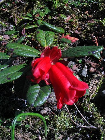 Und dann, nach endlos langen Wartejahren, zwei Blüten.Er gehört zu den behertesten Wild-Rhododendren:Rh. forrestii var. repens