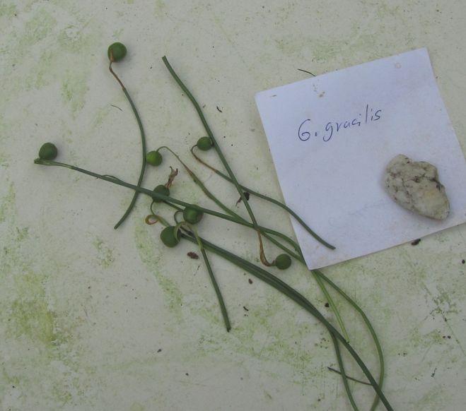 Die Samenstände von G. gracilis sind deutlich zierlicher. Die Blüten waren sehr unterschiedlich groß das Laub stets gedreht. Die Frücht dagegen sehr klein. Ob Samen drin reifen kann ich noch nicht sagen.Der Zettel auf dem die Namen stehen hat eine Kantenlänge von 10 cm.