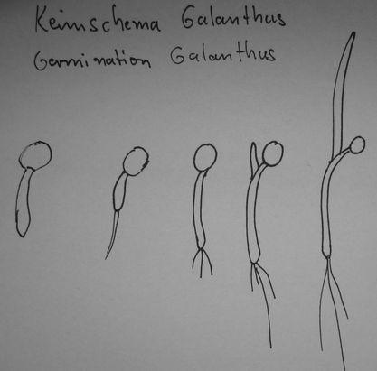 Also bei mir sind die meisten (alle?)gekeimt. Bei unterschiedlichen Arten verschieden schnell. Letzte sind die G. nivalis die aber dafür sehr gleichmässig aufgelaufen sind.In den meisten Töpfen siht man einige wenige schon über der Erde.Ich habe mal das Keimschema aufgezeichnet.Erst keimt ein ziemlich dicker weisser Schlauch der treibt dann eine dünne erste Wurzel. Die Protozwiebel wird länger und dann bricht das erste Blatt aus der oberen Hälfte des Schlauches. Gewöhnlich haben sie bis zu dem Stadium nur eine Wurzel in einigen Fällen habe ich auch mehrere gefunden.Die Samen die ich von G.plicatus vor einigen Jahren versehentlich in ein Gartenvlies gewickelt in Töpfen mit Erde gelagert hatte haben damals kleine kugelige Zwiebeln gebildet. Die Wurzeln wuchsen damals dann durch das Vlies.Das habe ich ohne Vlies nicht mehr beobachten können.Untersucht habe ich G.nivalis, elwesii, gracilis und plicatus.