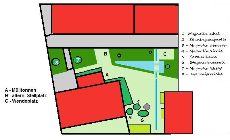 Zwischen diesem Stamm und dem Beet führt der Weg zu "C". Ob ich ihn als "Skulptur" stehen lasse, oder doch noch bis auf den Stumpf abtrage, bin ich mir noch nicht sicher. Es ist immer schwierig, eine größere Situation so detailgetreu wiederzugeben, wie sie sich vor Ort tatsächlich darstellt, ohne alles im Rundumblick komplett abzufotografieren, was mir auch nicht immer unbedingt behagt.Die Vorpflanzung etwas "lebendiger" werden zu lassen widerspricht meiner Meinung nach nicht dem Grundziel. Ich habe da eher unterschiedliche Höhen im Kopf. Zum Beispiel, einige zurückhaltende Stauden aus der Hintergrundbepflanzung (Hosta, Epimedium) an der Ecke des Beetes nochmal aufzugreifen und beispielsweise mit Molinia architektonisch in die Höhe zu führen. Aber das sind noch unausgegorene Gedanken. - Gartenplaner