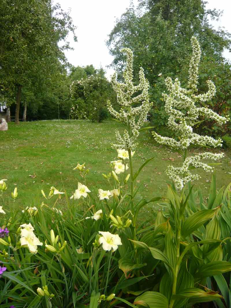 Mein Veratrum nigrum steht schon jahrelang im Schatten, sah immer gut aus, aber von Blüte keine Spur. Dieses Jahr ist er auch nicht größer als in den vergangenen Jahren, aber er bekommt eine Blüte, sie wird täglich höher, ist jetzt ca 150cm, aber es dauert noch einige Zeit bis sie sich öffnet.