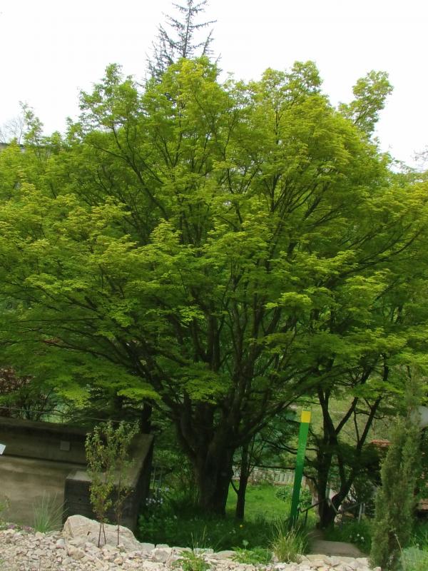 Die Eichen passen kaum auf ein Bild. Der Vergleich mit dem Katsurabaum im Hintergrund lässt die grösse erahnen. Am rechten Rand ist eine farnblättrige Buche zu sehen.