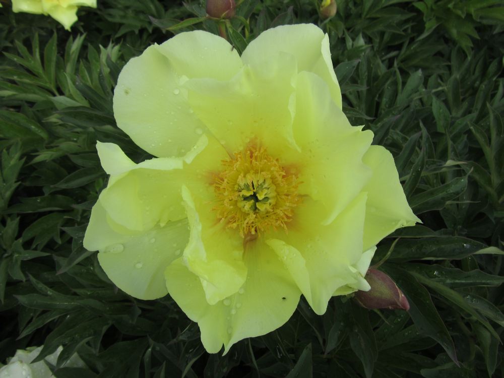 Hier ein Bild der vermeintlichen `Yellow Crown´, von der ich zwischenzeitlich gar nicht mehr so sicher bin, dass sie es wirklich ist. Den die Pflanzen sind eigentlich doch eher strauchpaeonienartig, die Blüten kommen fast ausschließlich an verholzten alten Trieben, neues wird eher sporadisch gebildet. Die Pflanze ist +/- 50cm hoch, also recht niedrig, die Riesenblüten nicken deutlich unter das Laub, auch keine Eigenschaft für die die Itohs der ersten Generation bekannt sind, oder doch ?Das Bild zeigt nicht meine Pflanze, diese ist noch zu jung, aber eines ihrer Geschwister.Ich habe schon längere Zeit eine Namenlose, vermutlich ist es `Yellow Crown´,