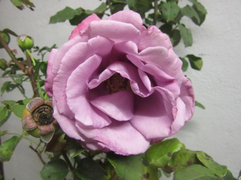 Heute habe ich, völlig ungelogen meine erste selbst gekaufte Rose mit nach Hause gebracht. Dort wo ich sie herhabe war sie eine Falschlieferung in einer andern Sorte, man hat sie mal als "Möglicherweise Mainzer Fassnacht" bezeichnet.Diese (letzte) Blüte hat einen Durchmesser von achteinhalb Zentimetern, die Farbe ist bei jüngeren noch "blauer", sie fiel mir schon vor ein paar Wochen auf, habe sie damals vergessen. Der Duft ist eher rosenuntypisch, zumindest nehme ich das an, habe ihn sofort mit dem von Paeonien assoziiert, weswegen ich auch sehr gerne ihren Namen kennen würde. Falls die Pflanze irgendwann mal kaputtgeht und ich die Sorte nachpflanzen will. Was sagen die Kenner? Ist `Mainzer Fassnacht´ möglich, wahrscheinlich oder unmöglich? Ich weiß, hundertprozentige Identifizierung schwierig...