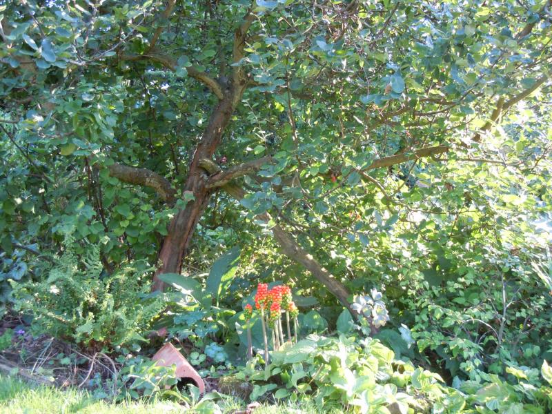 Dieses Eck ist grundsätzlich nicht mediterran bepflanzt. Aber Arum italicum "Pictum" unter der Quitte, das passt