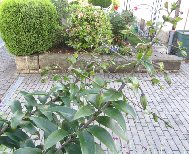 Früher war jedesmal bei nicht ganz so intensiver Schädigung ein Wachstumsstopp des Blütentriebs zu beobachten. Die Blüten entwickelten sich zum größten Teil verkrüppelt und die geschädigten Blätter starben nach und nach weitgehend ab. Vermutlich Botrytis.Das ist hier trotz des wenig günstigen Wetters nicht zu beobachten.So ist das Wachstum über der geschädigten Zone.