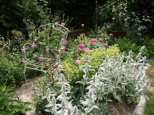 ...die rote rose die hervorspeanzelt (hervorlugt) ist Ms. Delbard, die im verein mit der clematis William Kennett und einer dunkelblauen (die eigentlich 'Julia Correvon' hätte sein sollen) eine seite der terrasse abgrenzt, und um diese jahreszeit einen ziemlichen hingucker abgibt.
