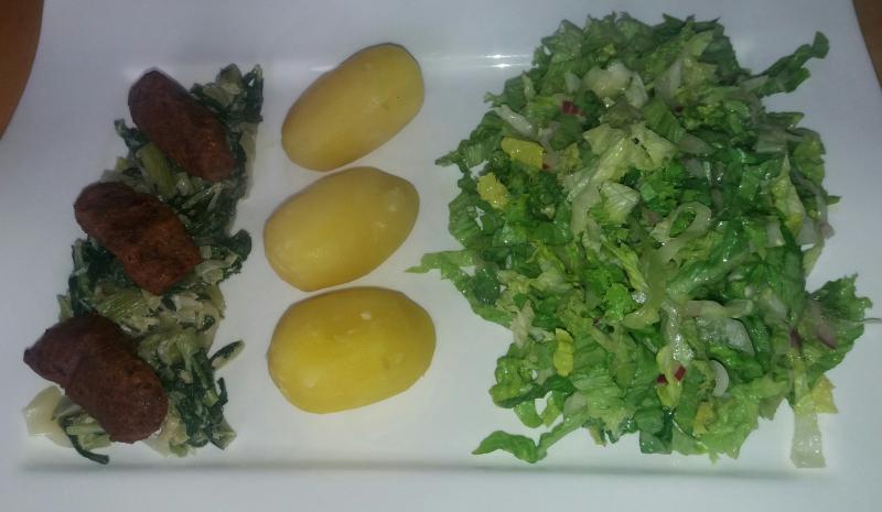 Dazu grünen Salat, Essig-Öl, Zwiebel, Estragon, Kreuzkümmmel, Limonenblatt und kleingeschnittene Salzzitrone. Salzzitrone macht sich sehr gut uin Salatsoßen, stelle ich fest. :)