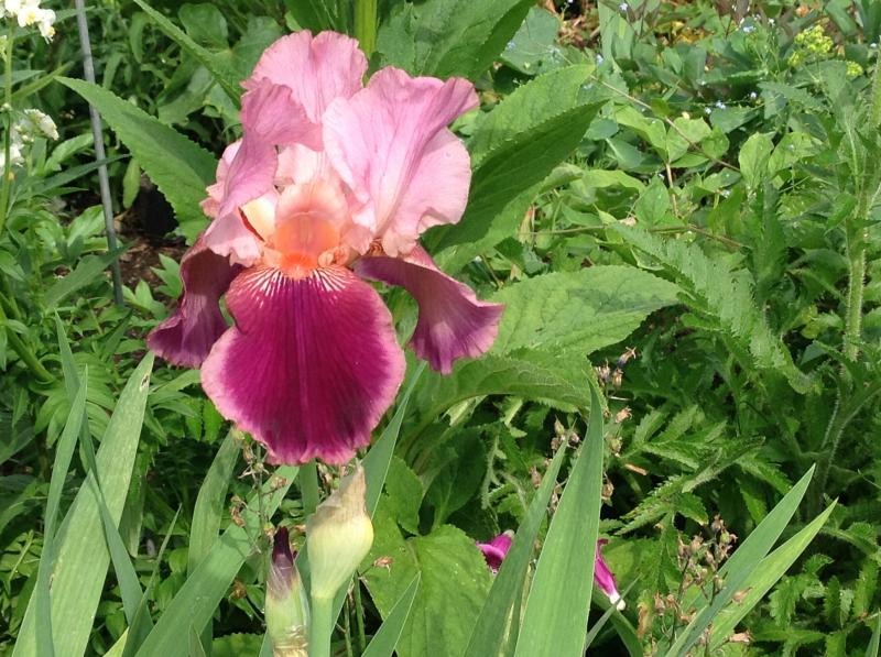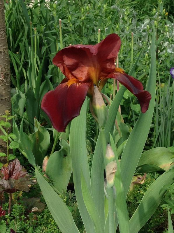 Nach dem Neupflanzen letztes Jahr besitze ich nun drei Iris, die ich zusammensetzen möchte, wegen der ähnlichen Farbe, dunkelrot, bräunlich, ins Dunkelviolett gehend. Dazu suche ich eine Pflanze, die jetzt, Ende Mai, Anfang Juni, am besten aussieht, niedriger als die Bartiris ist und, am allerwichtigsten, sehr hellgrün oder gelbgrün ist /blüht. Hellgrün kann die Blüte oder auch die Blattfarbe sein.