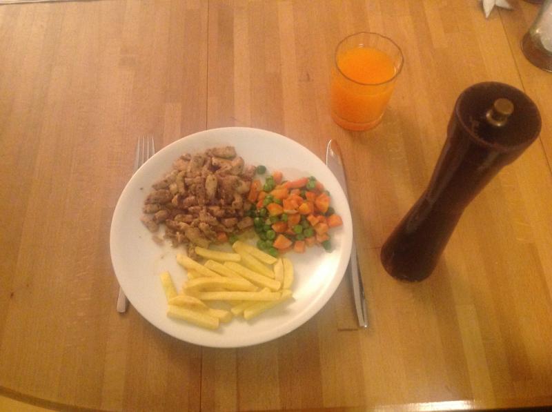 ich hatte Zander und Bratkartoffeln mit buntem Salatteller, GG hatte Rumpsteak, Bratkartoffeln und Salatteller