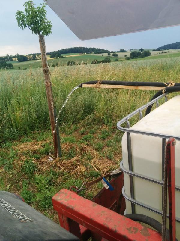Wir sind dann auch öfters rausgefahren um die Apfelbäume und natürlich auch die neu gepflanzten Hecken zu gießen. Dabei eine Zapfwellenpumpe an den Traktor geschnallt und ein 800 Liter Regenwassertank auf die Erdschaufel raufgetan. Dann noch eine kurze Halterung um den Schlauch zu halten und man kann gemütlich vorbei fahren. Wasserquelle haben wir direkt an der Wiese in Form von einer Drainage.