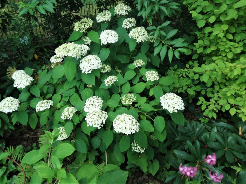 Ich meine relativ schmales und verhältnismäßig kleines Laub zu erkennen. Es wäre zwar ungewöhnlich, weil die Sorte hier eigentlich eine Rarität ist, aber es könnte sich um Hydrangea arborescens subsp. discolor 'Sterilis' handeln.