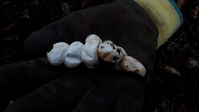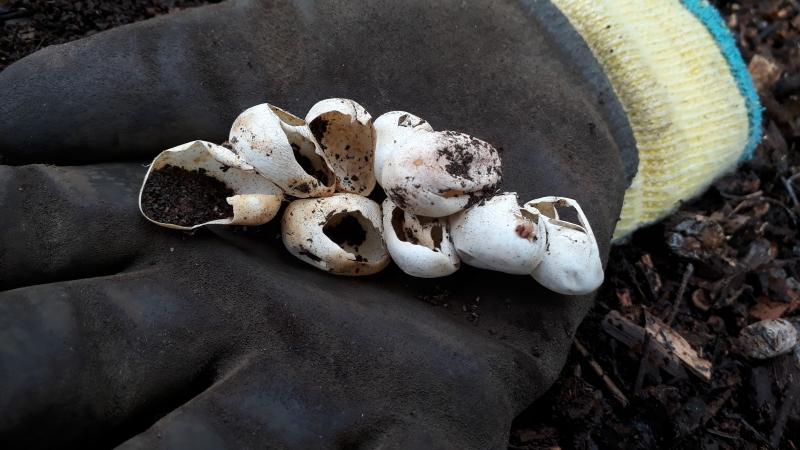 Heute habe ich reichlich vom wunderbar angerotteten Mulchmaterial des großen Schredderhaufens abgetragen. Plötzlich leuchtete mir etwas Helles entgegen, das mir im ersten Augenblick wie Styropor erschien.
