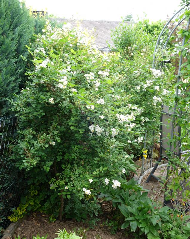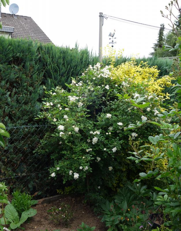 Als ich eine Multiflorarose kaufen wollte, waren die angebotenen Pflänzchen etwas mickrig (und preisgünstig). Da habe ich gleich zwei genommen und nebeneinander gepflanzt :-[ - das Ergebnis ist beeindruckend ...