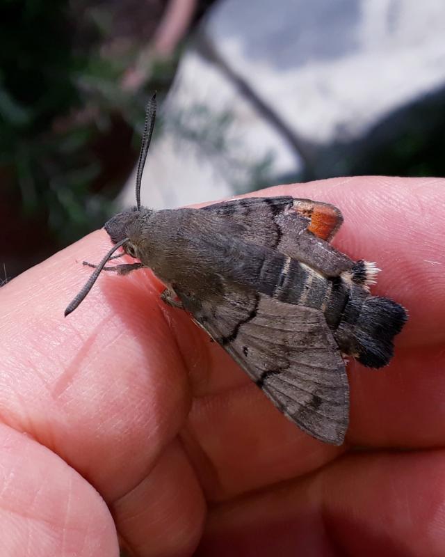 Ich setzte das Tier anschließend an den Phlox wo es gleich ins Laub flatterte. Heute sah ich es wieder an der Stelle, wo ich es gestern fand. Es tut mir leid, denn dieses Tier hat seine Flugfähigkeit verloren und kann so auch nicht mehr wie ein Kolibri über den Blüten stehen und Nshrung aufnehmen ...